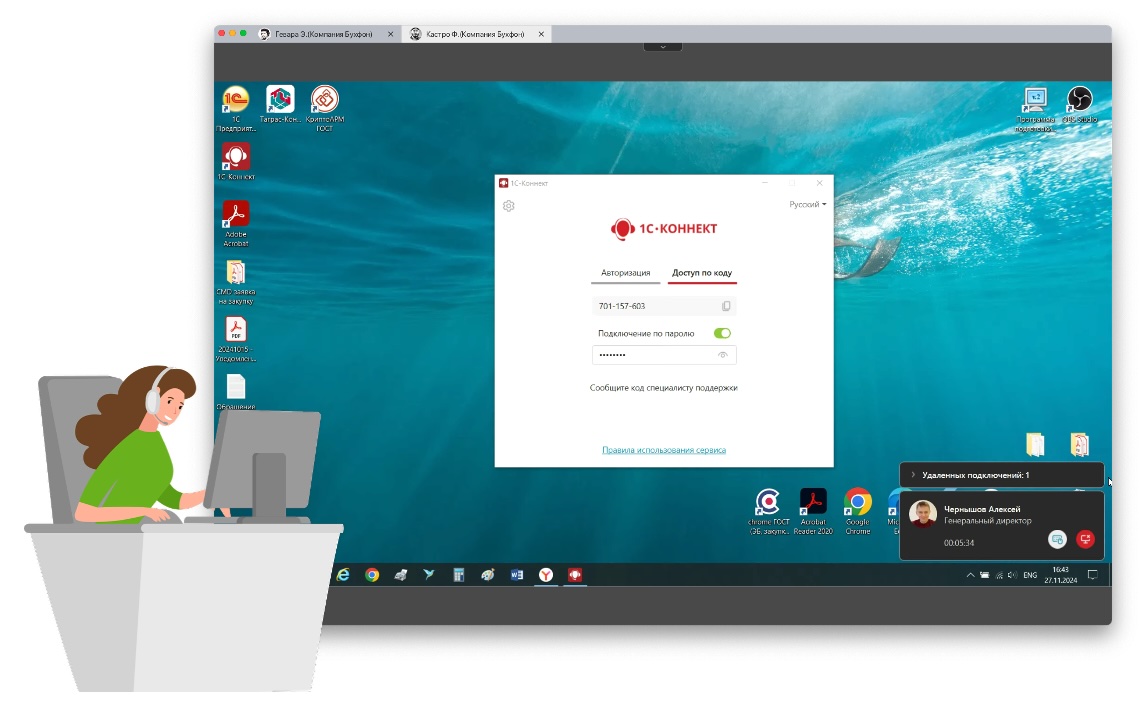 - Подключение через 1С-Коннект к рабочему столу осуществляется с согласия пользователя и под его контролем.