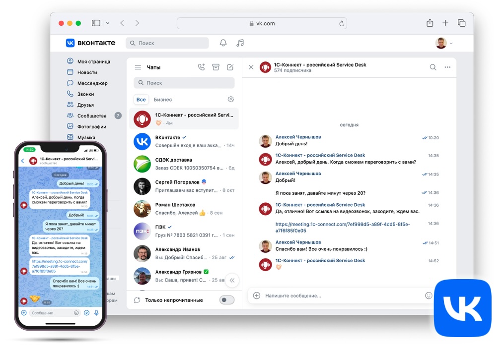 Подключите страницу компании (сообщества) в VK и обращения от пользователей VK будут доставляться в 1С-Коннект вашим специалистам.