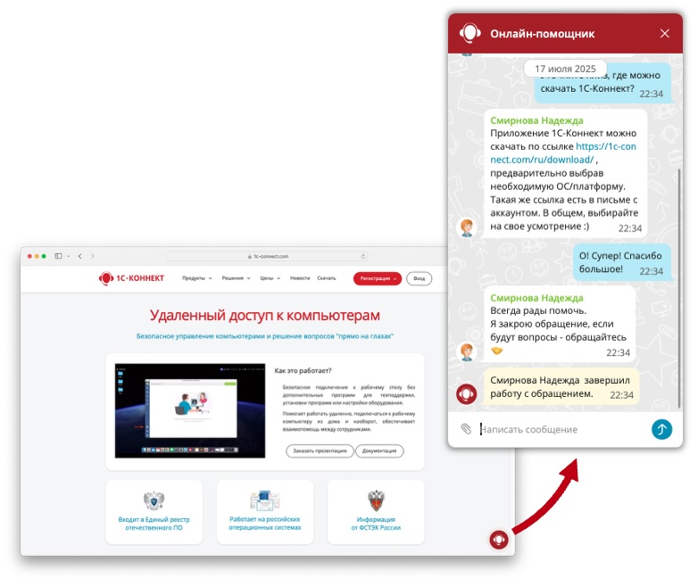 Можно оперативно взять клиента в работу: передать ссылку на видеозвонок и вести переговоры по видеосвязи. Или передать ссылку на скачивание приложения, подключиться удаленно по коду и настроить аккаунт для регулярной поддержки.