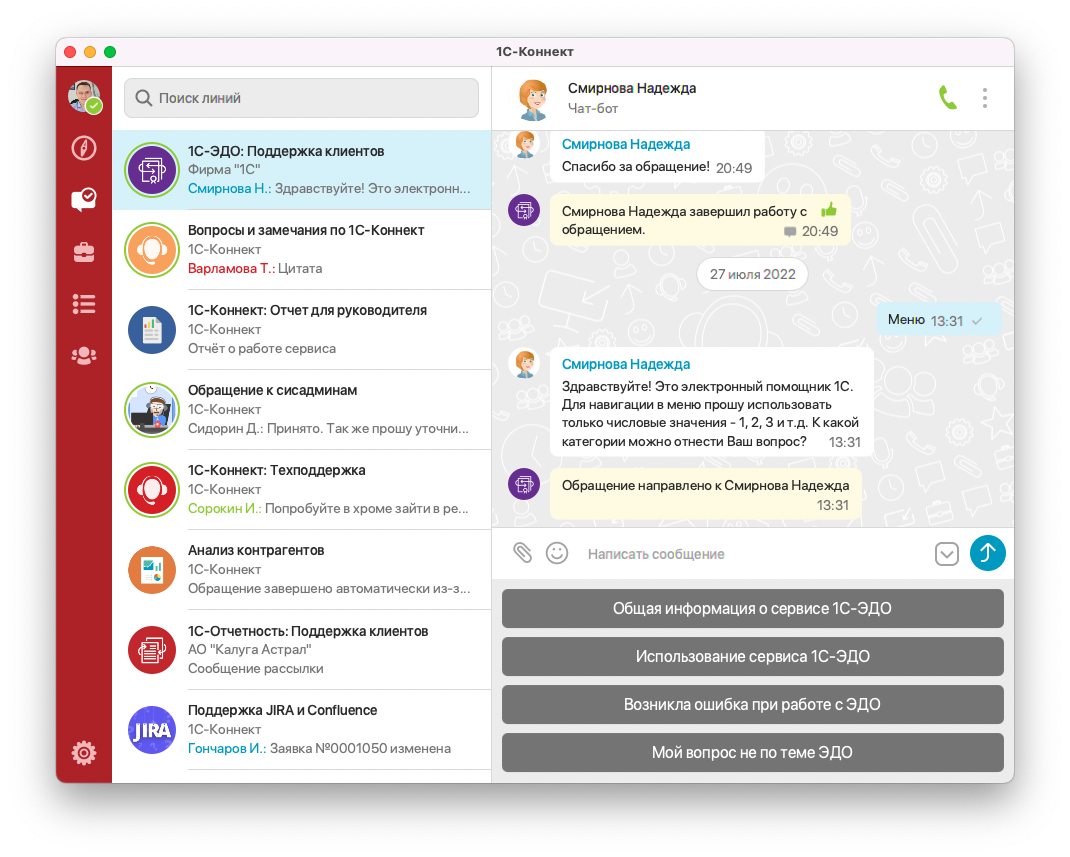 Встроенное меню в чате линии позволяет организовать самообслуживание пользователя и навигацию любой вложенности.