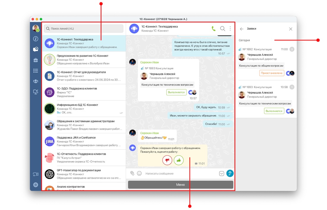 Безопасный мессенджер компании с линиями для сотрудников и прямая связь с нашими специалистами по всем вопросам поддержки 1С и сервисов 1С:ИТС.