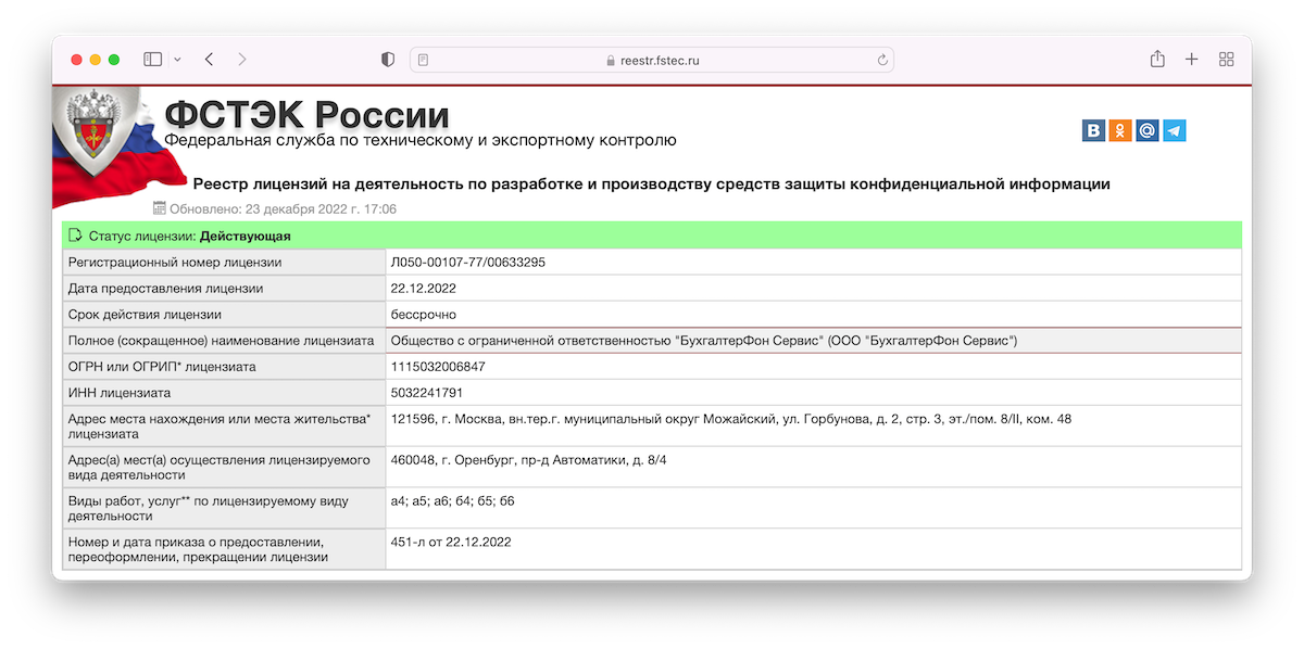 Федеральная служба по техническому и экспортному контролю (ФСТЭК России) подтвердила компетенции нашей компании и выдала лицензии (опубликованы на сайте регулятора):