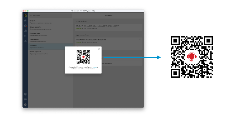 В приложении 1С-Коннект для компьютера (начиная с версии 5.2.2.1091) появилась возможность быстро скачать мобильное приложение 1С-Коннект и авторизоваться в нем, используя QR-код.