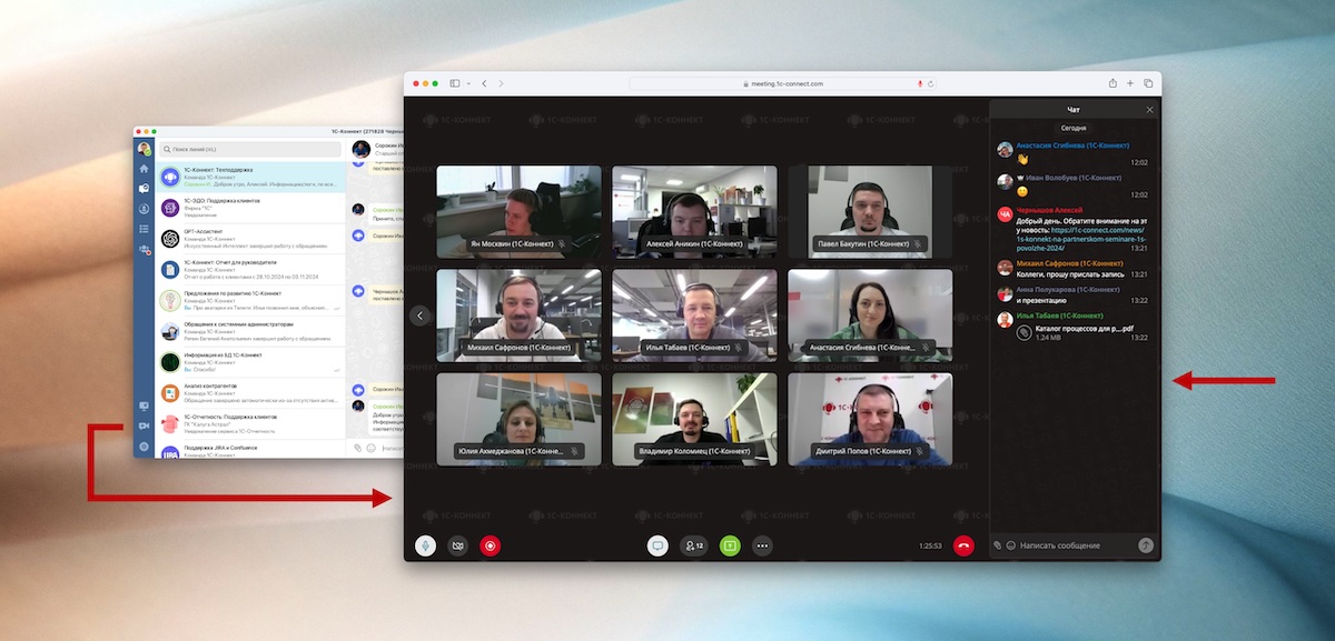 В видеозвонках 1С-Коннект стал доступен внутренний чат. Ранее для переписки во время видеозвонка использовался чат в приложении 1С-Коннект, но для внешних пользователей (приглашенных по ссылке и не имеющих аккаунтов 1С-Коннект) такой чат был недоступен. Теперь все участники видеозвонка могут обмениваться сообщениями, ссылками и файлами, не выходя из пространства видеозвонка.
