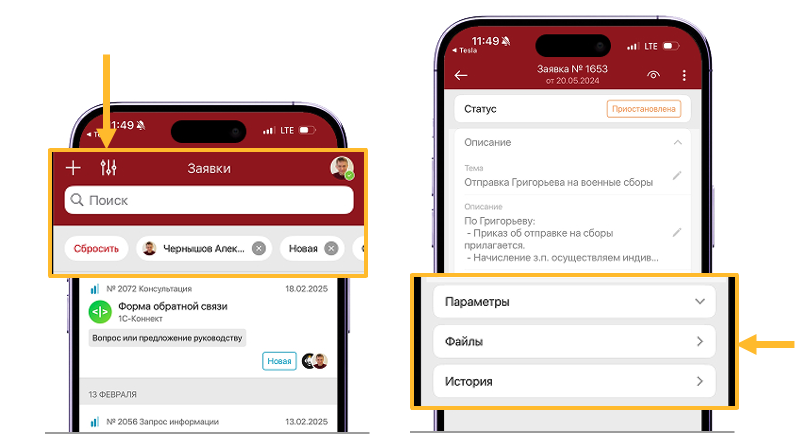 По каждой заявке можно добавлять файлы и вести переписку (функция стала доступна и в приложении для iOS).