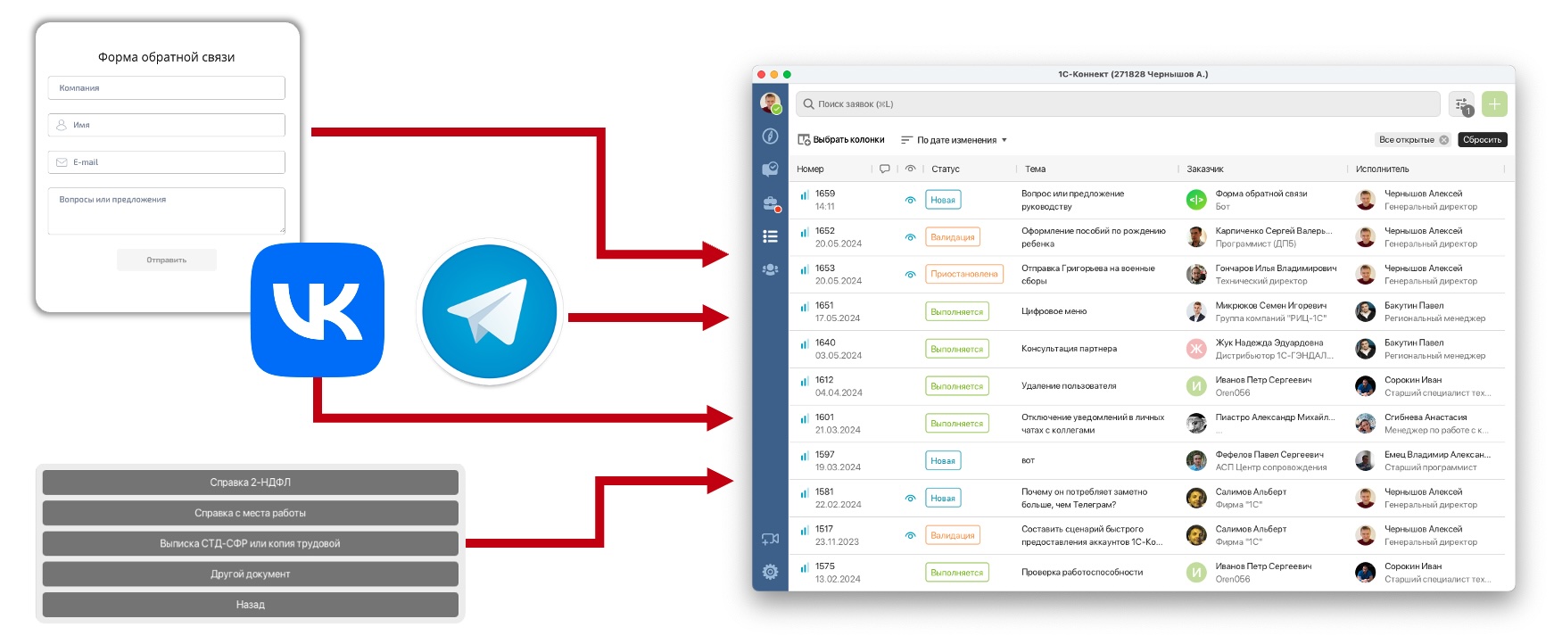 Если вы используете портал самообслуживания - можете разместить на нем форму для запросов и подключить ее к 1С-Коннект. Пользователи смогут отправлять вам заявки через сайт (или портал), описывать ситуацию, прикладывать файлы, а специалисты смогут работать с поступающими заявками через 1С-Коннект.