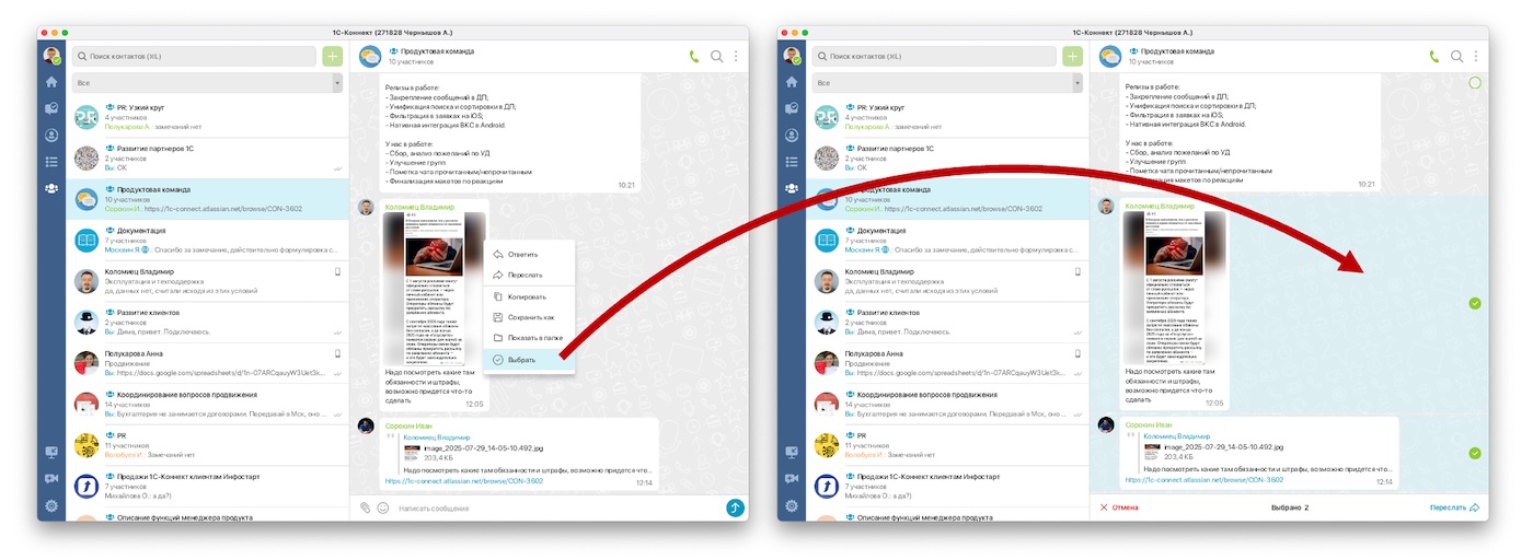 Используя контекстное меню, теперь вы сможете выбрать в чате одно или несколько сообщений или файлов и переслать их в любой другой доступный вам чат по линии, в группу или коллеге.