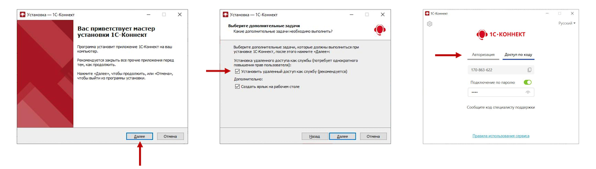 Приложение 1С-Коннект автоматически запустится после установки, в окне авторизации пользователь сможет ввести логин и пароль аккаунта 1С-Коннект или переключиться в режим доступа по коду для подключения специалиста поддержки.
