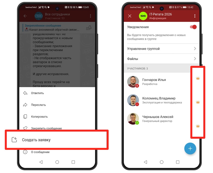Расширен механизм поиска. В приложении теперь можно находить коллег и клиентов по номеру телефона, должности, названию организации или подразделения. Механизм поддерживается при создании новой группы и в разделе Заявки.