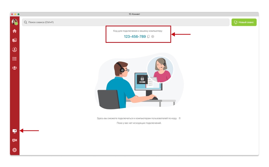 При подключении в компании дополнительной функции удаленный доступ по коду (в том числе входит в полный тариф для партнеров 1С и в корпоративные тарифы Бизнес и Премиум), сотрудники компании смогут инициировать подключения к сторонним компьютерам по коду.