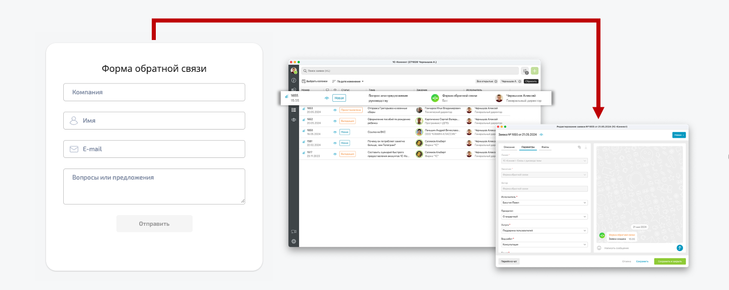 Заявки с web-формы будут автоматически доставляться в приложение 1С-Коннект, что позволит сотрудникам работать с ними из единого инструмента.
