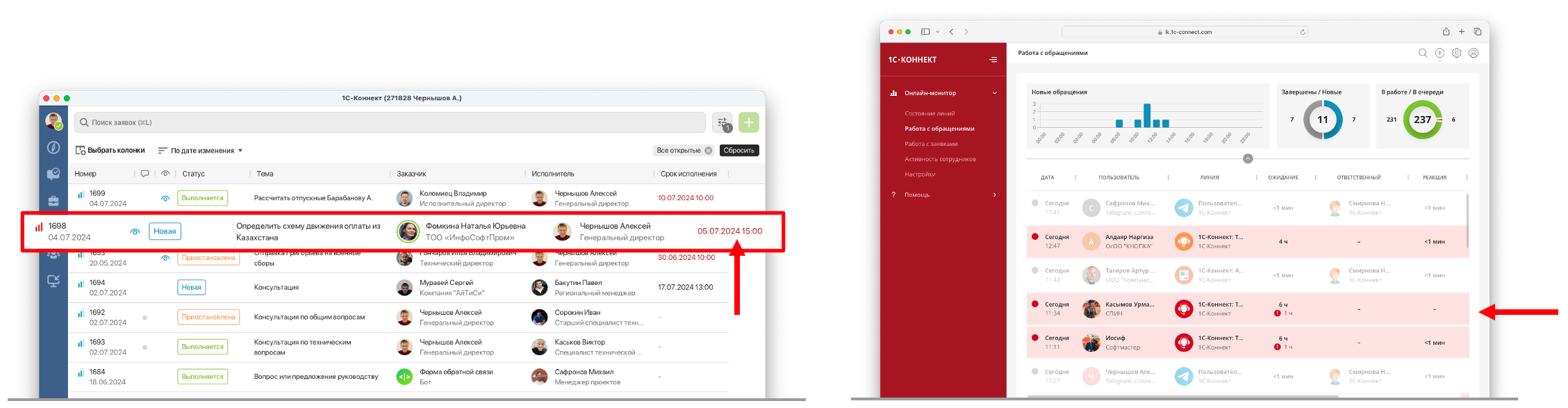 Важно предусмотреть инструменты мониторинга и контроля. Например, через сервис 1С-Коннект обеспечить оперативный мониторинг выполнения нормативов на всем жизненном цикле работы с обращениями, контроль сроков выполнения заявок и оценок качества консультаций. В сервисе предусмотрена система уведомлений и индикация в онлайн-мониторе по зафиксированным отклонениям.