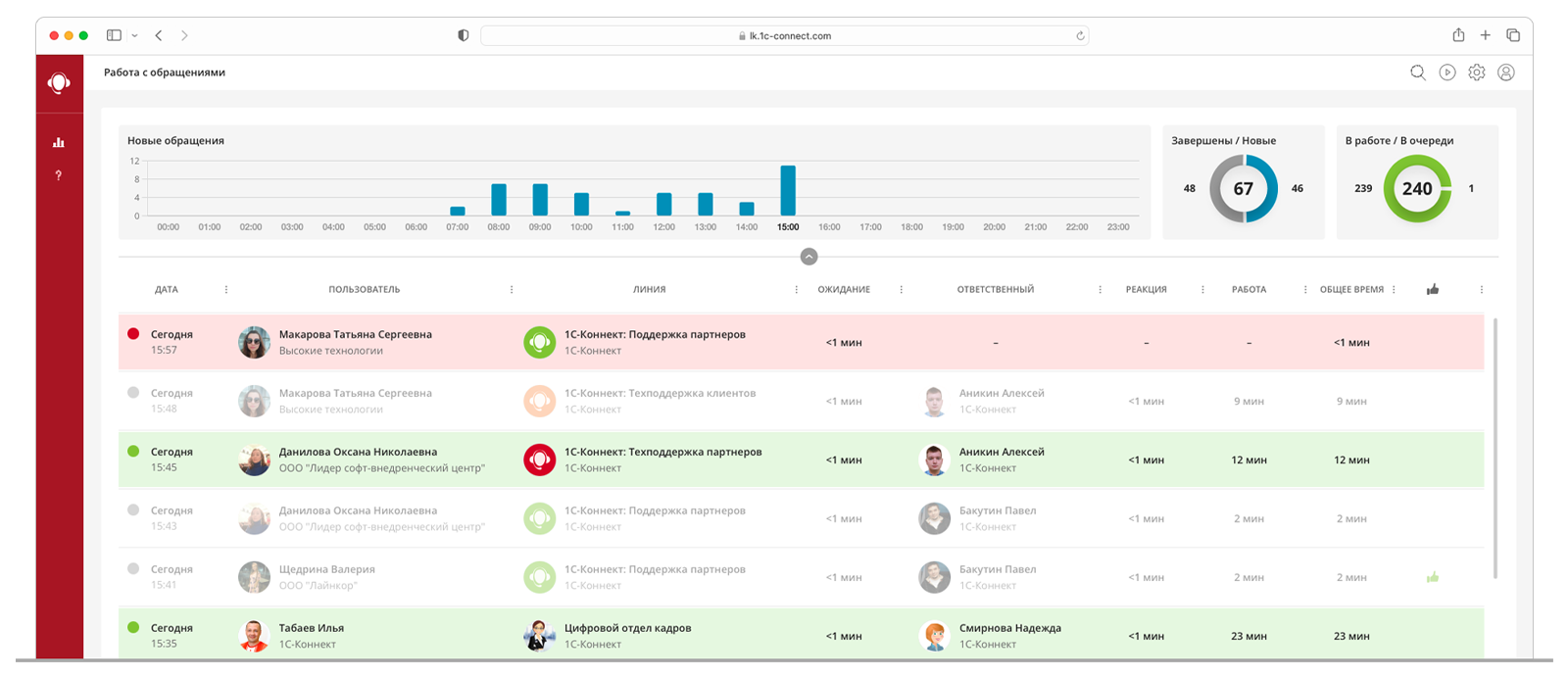 История общения с пользователями доступна всем сотрудникам по линиям, специалист может переводить работу на других коллег.