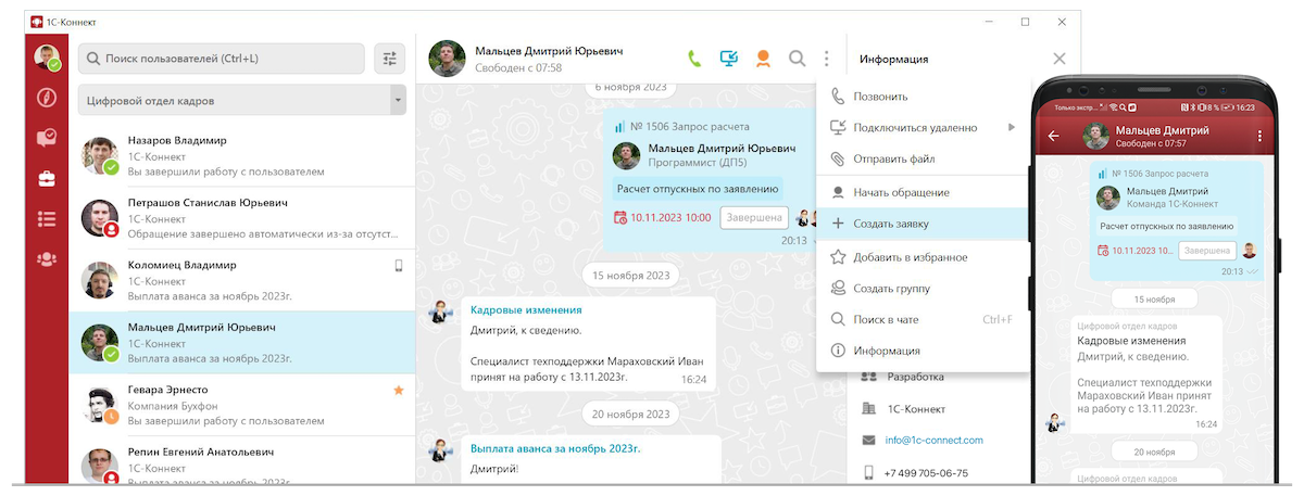 С пользователями можно переписываться в чате, обмениваться файлами или звонить, используя встроенную телефонию.
